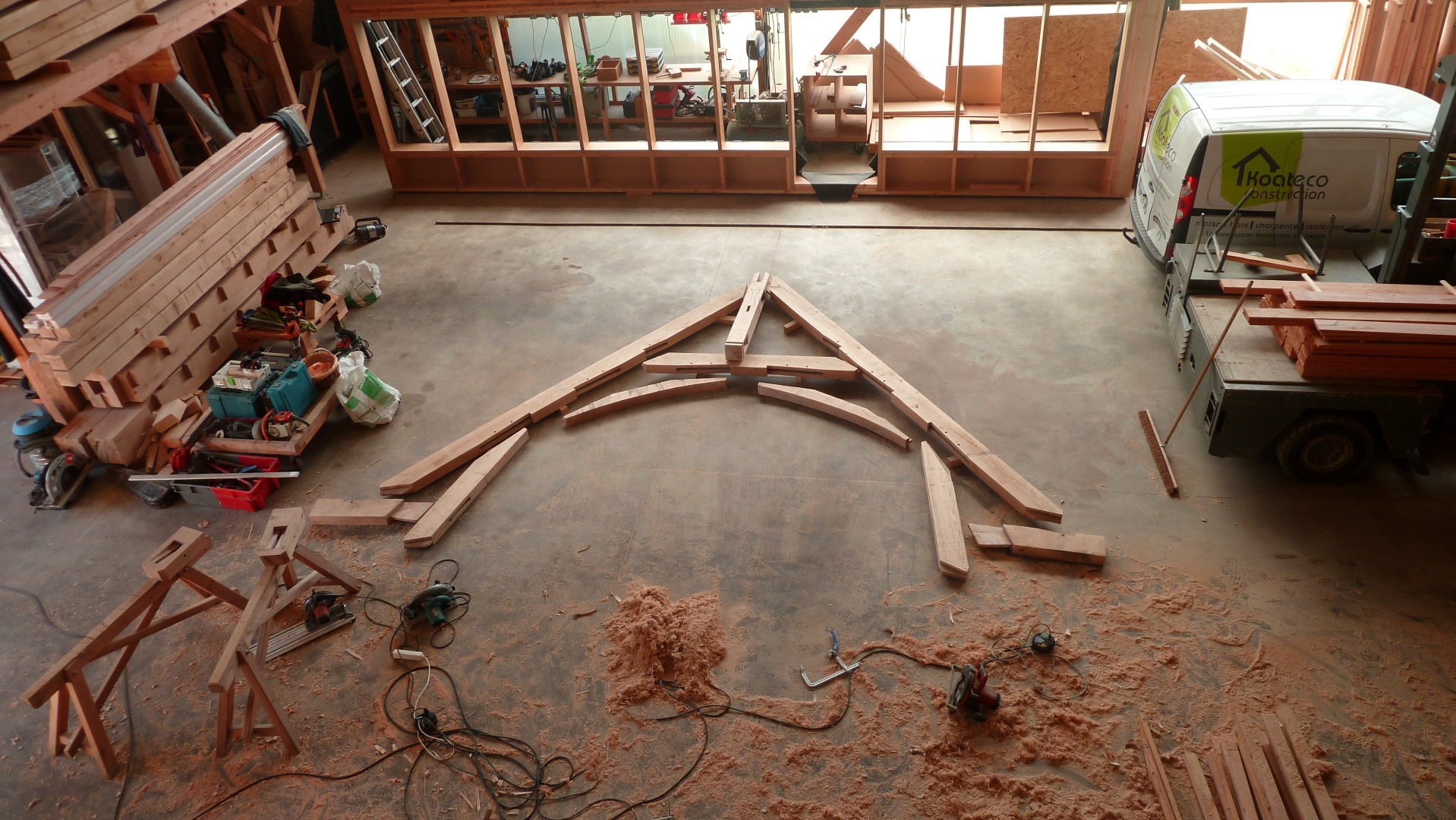 Nous réalisons tous les types de charpentes pour la construction de maison à ossature bois : les principes d’assemblages peuvent alors être cachés et sont donc basés sur des principes plus modernes comme les sabots métalliques, permettant ainsi de réduire les coûts. Les charpentes sont préfabriquées par modules en atelier, et posées très rapidement sur chantier avec une grue de manutention.