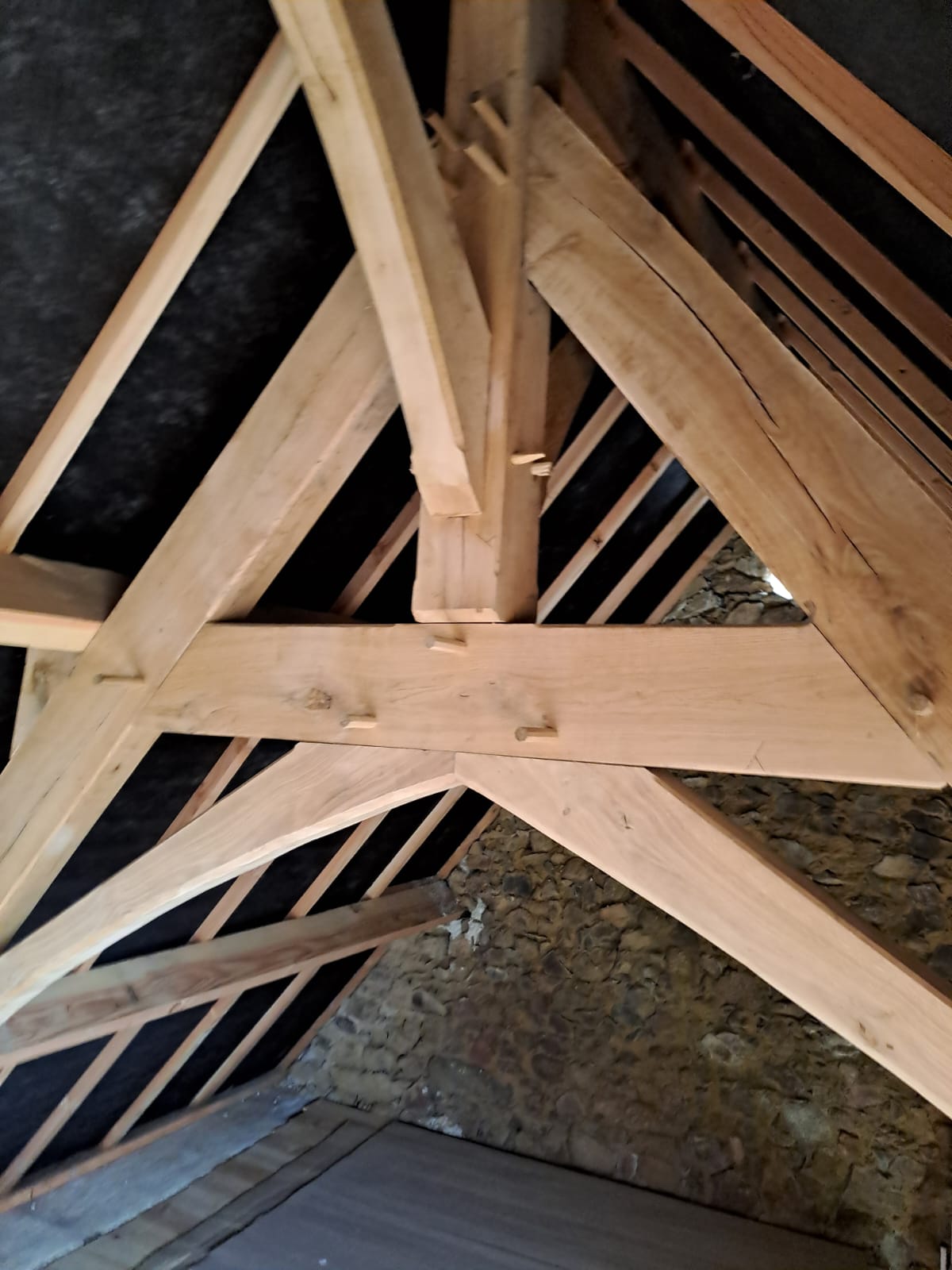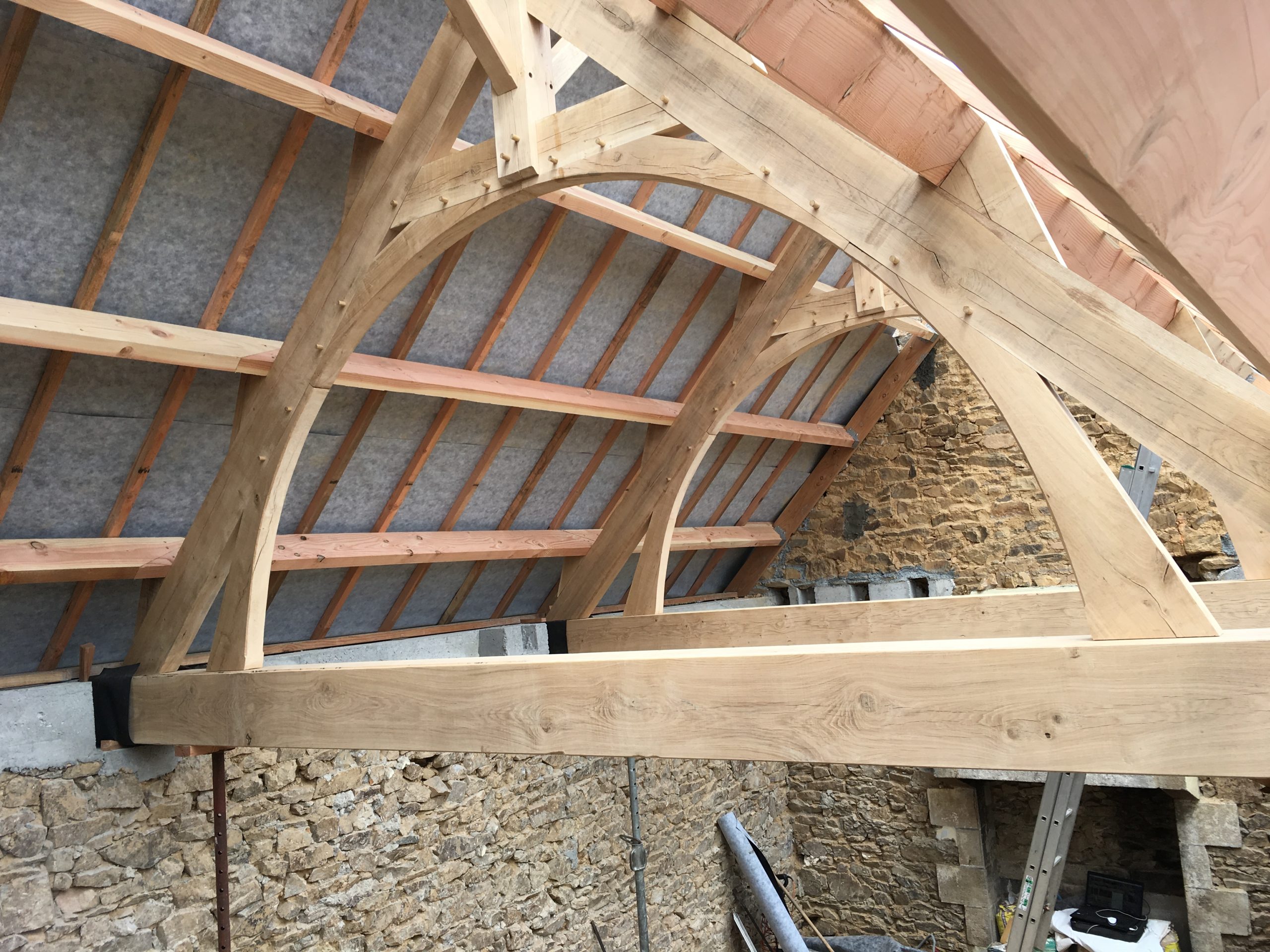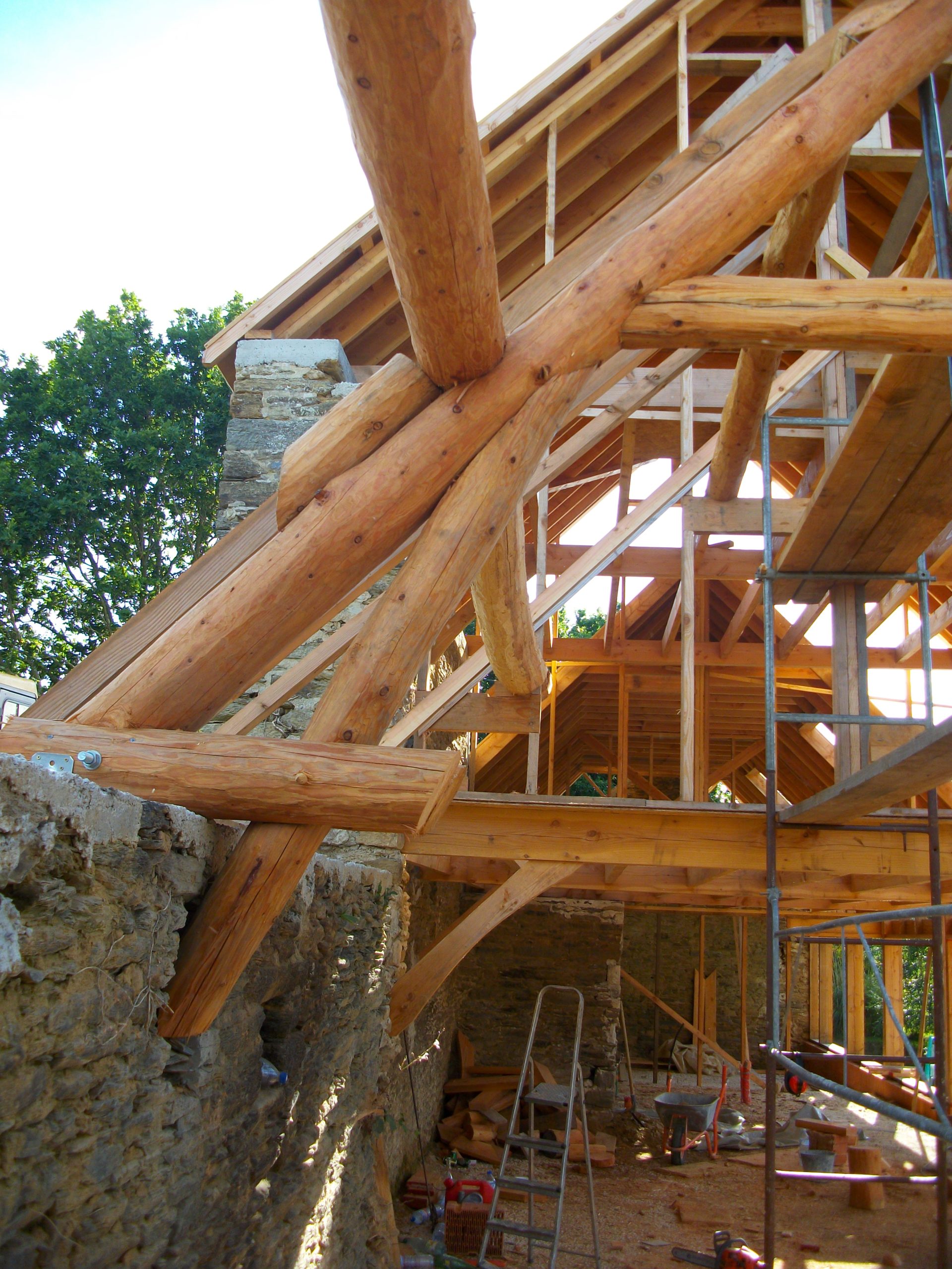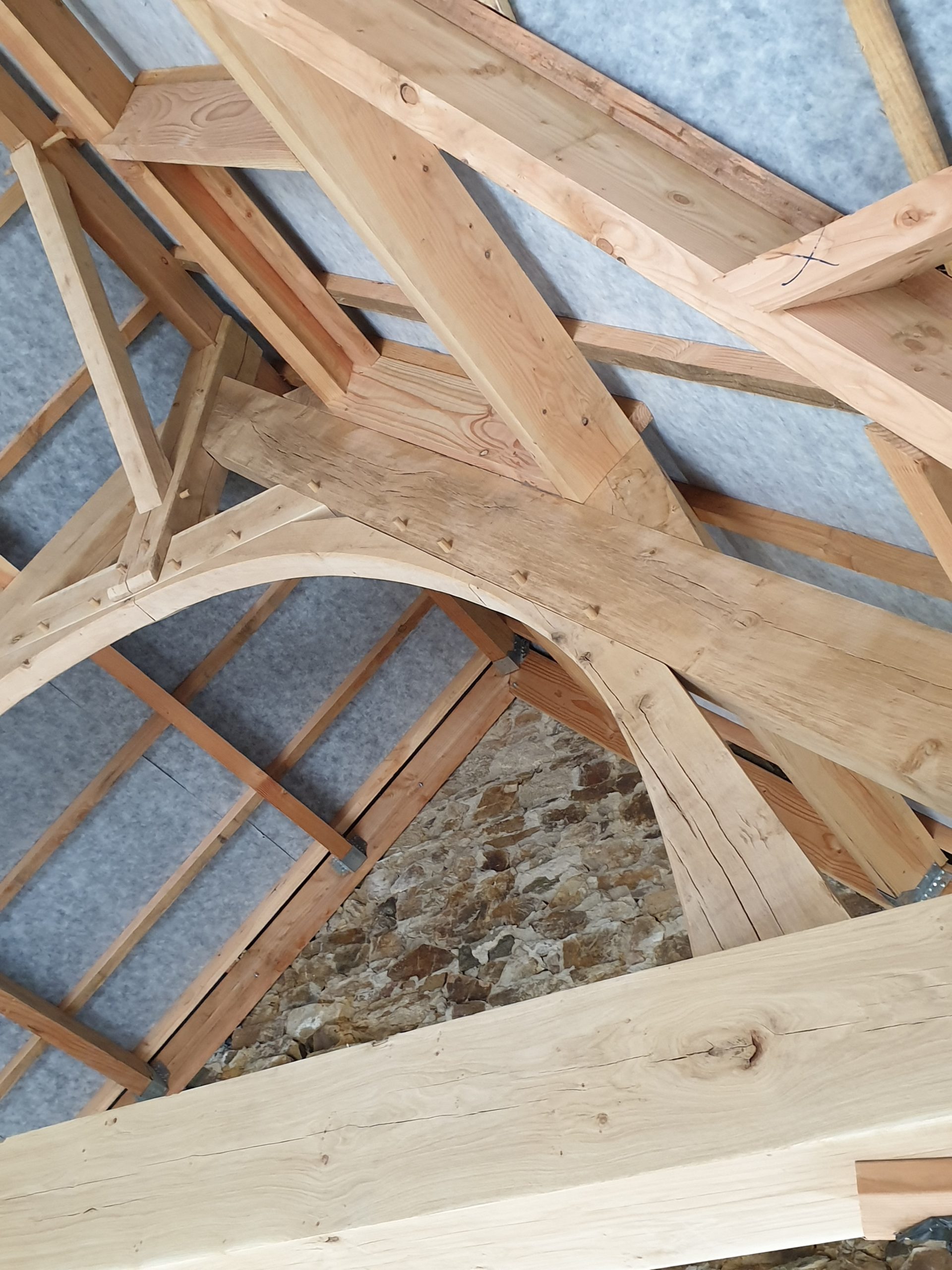 Chez Koateco Construction, nous avons tous été formés chez les Compagnons du Devoir. Dans le respect des traditions de la charpente, nous pouvons fabriquer des charpentes apparentes pour du bâti ancien ou neuf. Nous faisons alors appel aux systèmes d’assemblages traditionnels tels que tenons/mortaises ou embrèvements, et travaillons avec des essences telles que Chêne, Douglas ou Sapin, raboté ou non. Des structures en Lamellé collé d’aspect plus moderne ou en bois rond pour des charpentes uniques sont aussi réalisables.