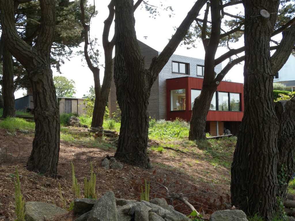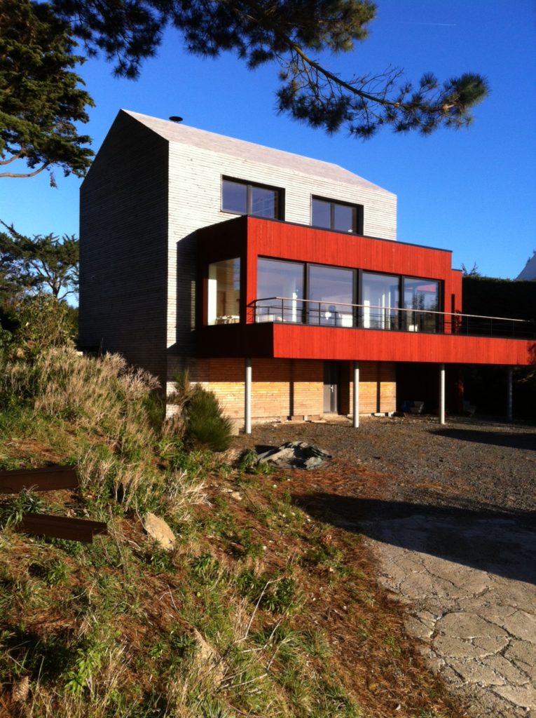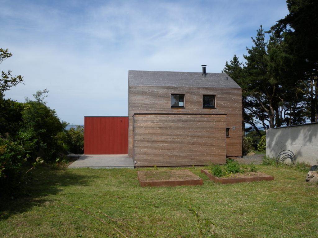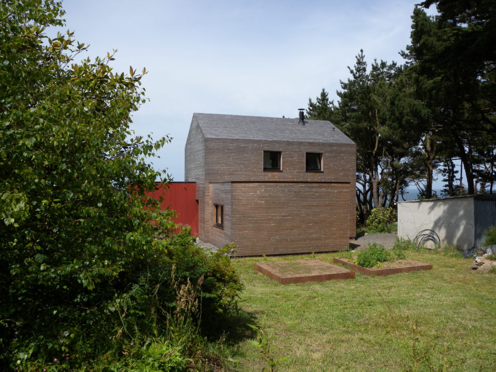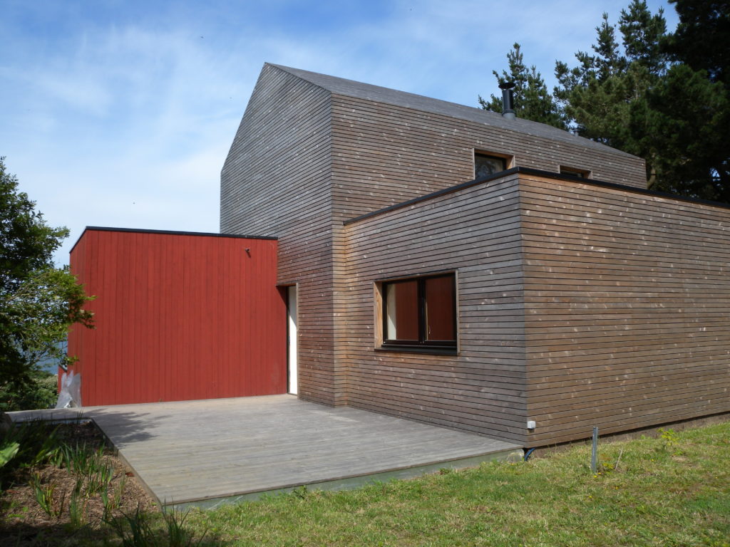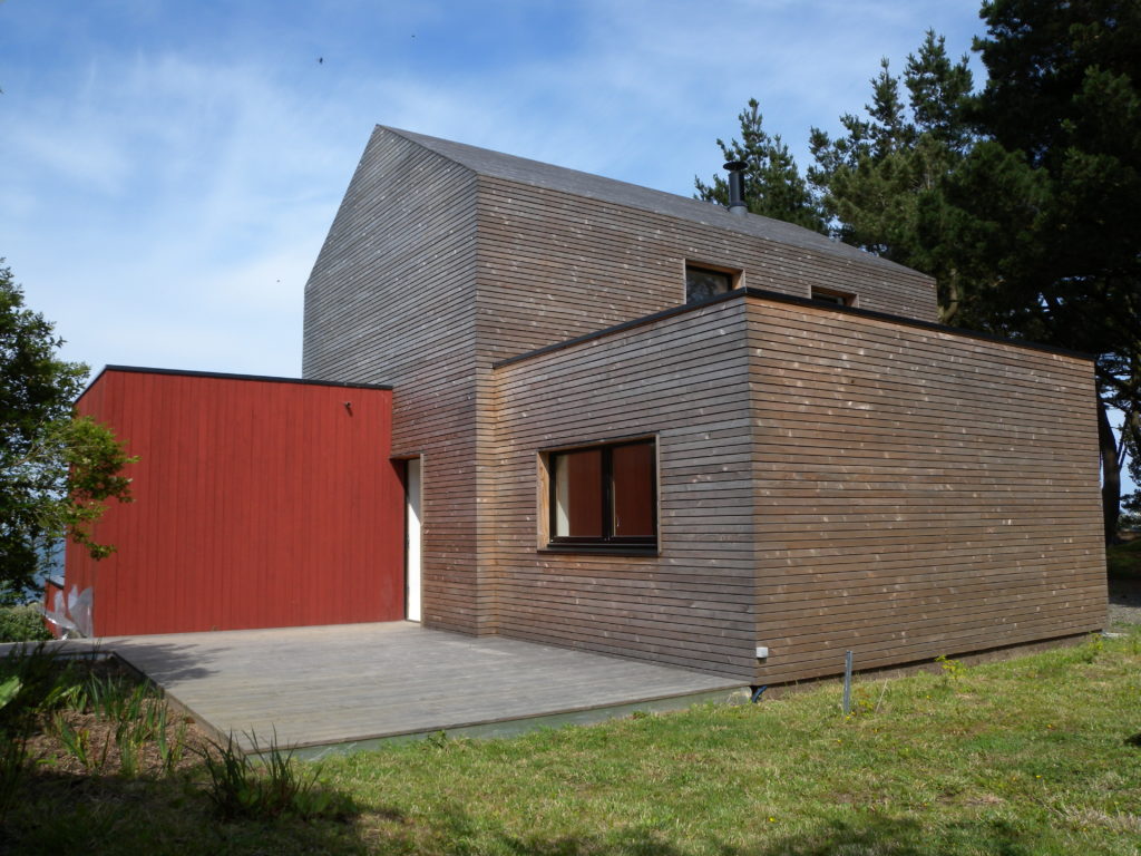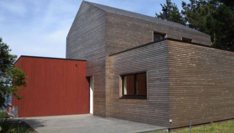 - Douglas purgé d’aubier horizontal ajouré (mur et toiture) et mélèze vertical à claire voie peint en rouge de falun
